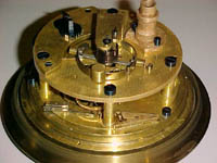 By this time the Bliss company was using movements made by London maker Victor Kullberg. This is a typical Kullburg reverse-fusee movement with a basic "Earnshaw" style balance. No auxiliary compensation was needed on a survey chronometer, and at this time the Navy no longer accepted chronometers with auxiliary compensation because of the difficulty of keeping them in adjustment. The fact that this has a steel hairspring may indicate that it was made for sale to the Navy. At this time John Bliss & Co., like some other makers, often used palladium hairsprings which are resistant to rust, magnetism, and are less affected by temperature. The Navy, however, demanded steel hairsprings on chronometers made for them. Palladium hairsprings, which are silver to white in color, were known to be softer and harder to work with than steel.