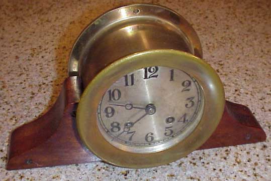 Chelsea Ship's Bell Clock, c. 1930 4.5" diam. with simple, possibly home-made, wooden base. 4 inch silvered dial, "John Bliss & Co." printed on dial, now very faded.