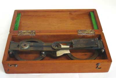 Designed to be used with "liquid compasses of standard sizes" to determine the bearing (azimuth) of objects at sea. Whatever compass was used had to be "prepared" by drilling an indentation in the very center of the glass to take the center pin. A swinging mirror (attached to the left side sight vane) allowed bearings of celestial objects, and a sliding eye shade on the right vane allowed bearings of the sun. Alternatively, sun bearings can be taken by lining up the shadow of the vertical thread with the line on the white section. Accurate sun bearings can be used to check compass variation at sea. For more details click on the catalog scan bottom right. Produced in 3 sizes which sold for $18.00, $20.00, or $22.00 in 1907. I don't know which size mine is, but overall length (vanes folded) is 7.5 inches, and the legs are 4.3 inches apart, requiring a compass face of at least 5 inches. This fits my No. 63 compass which has been "prepared" for this instrument.